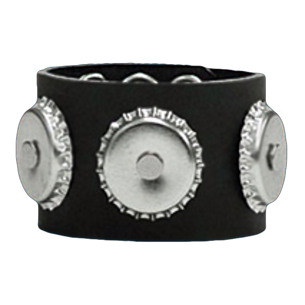There's nothin' better than a nice cold one... This great 3-Row wide wristband features riveted metal bottle caps all around and is made from high quality thick leather so you know it isn't some mallstore cheapo, it will last. The double snap closures adjust to fit wrists from 5 1/2" to 7 1/2" around.