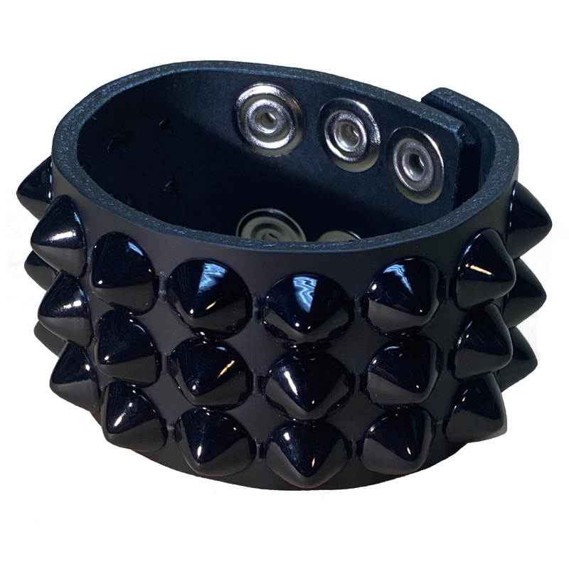 Check out our bad ass new black cone wristbands! Three rows of 1/2" black cones on 1 3/4" wide black leather. This black wristband made from high quality leather isn't some mallstore cheapo, it will last for life! The double snap closures adjust to fit wrists from 5 1/2" to 7 1/2" around.
