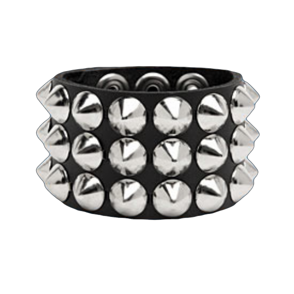 Add some attitude to your look with our new cone wristband! This awesome wristband features three rows of 1/2" chrome cone studs on 100% black leather. Made from high quality thick leather so you know it isn't some mallstore cheapo, it will last for life! The double snap closures adjust to fit wrists from 5 1/2" to 7 1/2" around.